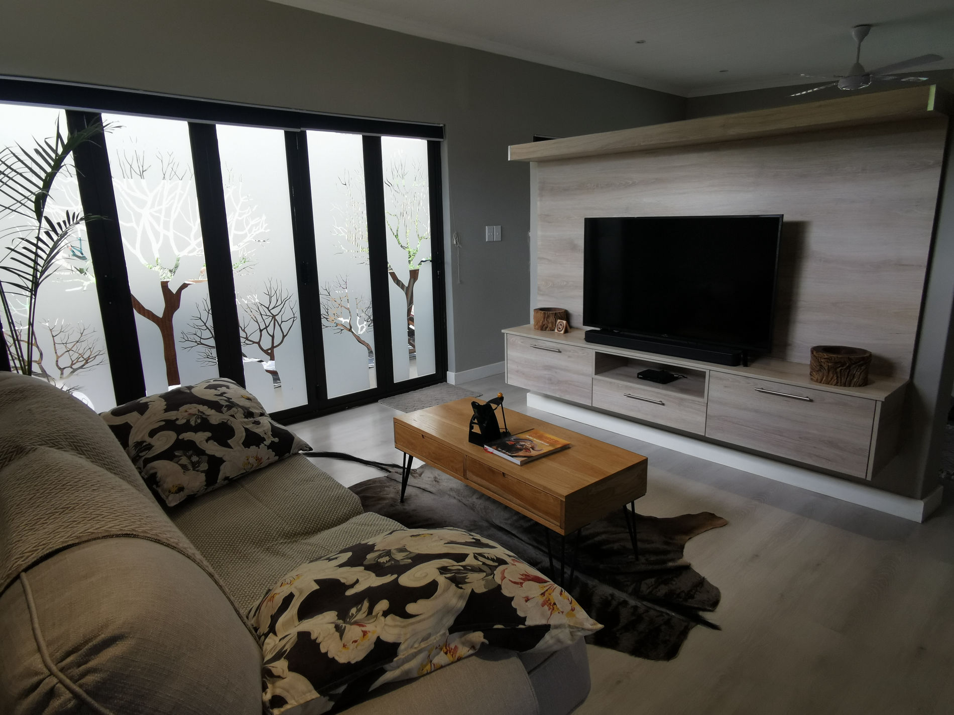 This fully furnished, comfortable cottage can accommodate 2 adults and consists of open-plan living. The bedroom area is furnished with a king-size bed, and features an en-suite bathroom with a shower. The open-plan well-equipped kitchen contains a gas stove, an electric oven, a fridge, a microwave, a coffee machine, a dishwasher, and other appliances to use. The adjacent lounge features a big-screen TV with Netflix viewing and selected DStv channels; stack doors open to the private patio which has a built-in (barbecue) braai facility for guests to use.